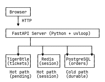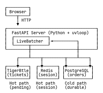 So I built it. Three days later, I had a working demo. What started as an educational project became a 19-day optimization journey that pushed the system to 977 ticket reservations per second—15x faster than the Oasis baseline1. All in Python.
