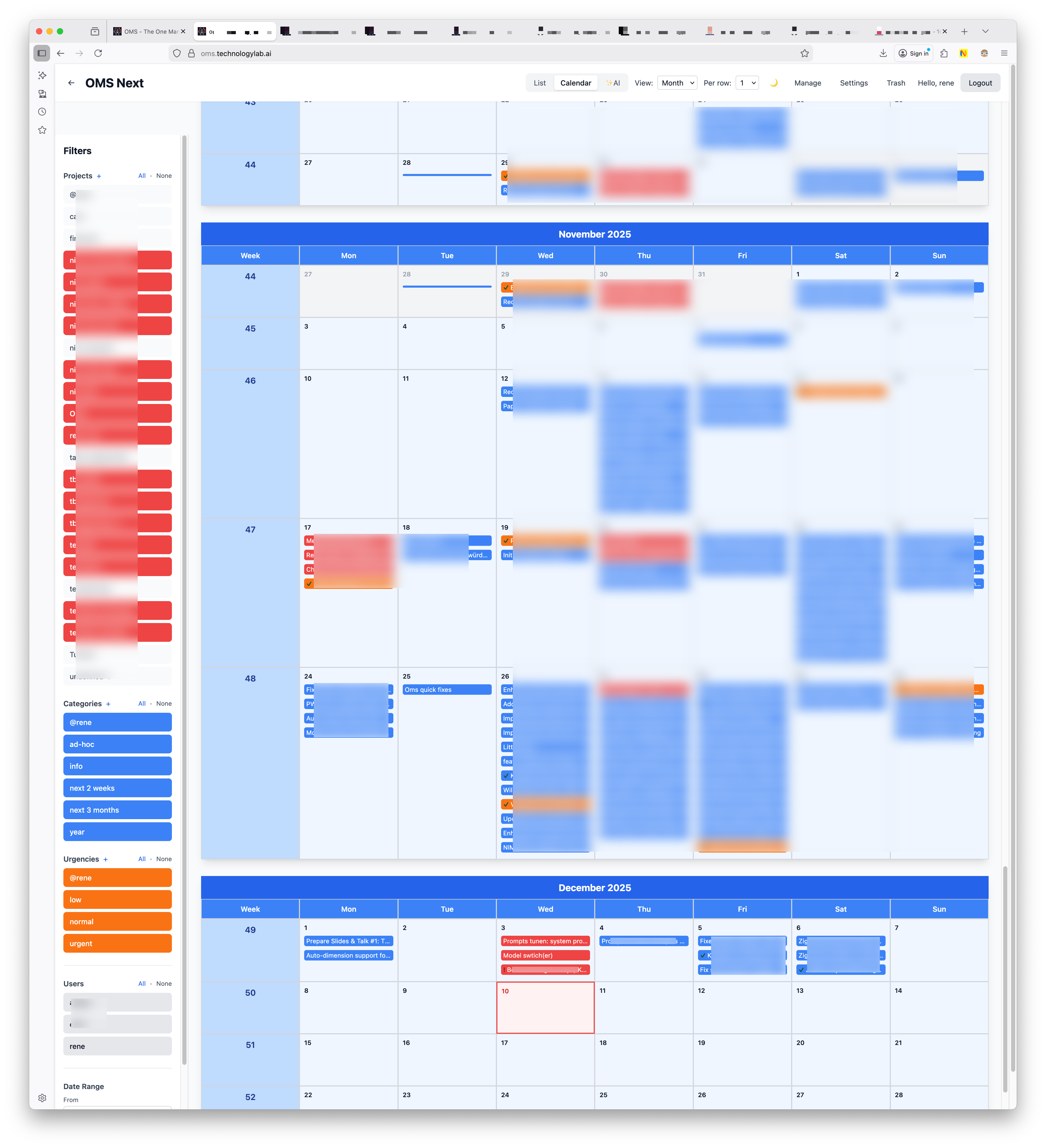 I built the OMS Calendar as an Observer. It focuses less on scheduling and more on visualizing. It maps my Logs (what I actually did) against my Assigned Dates (soft nudges for the future).
