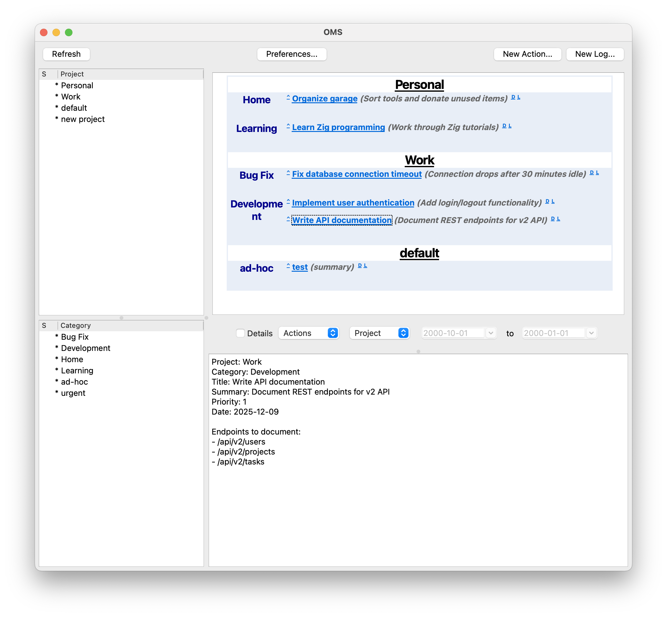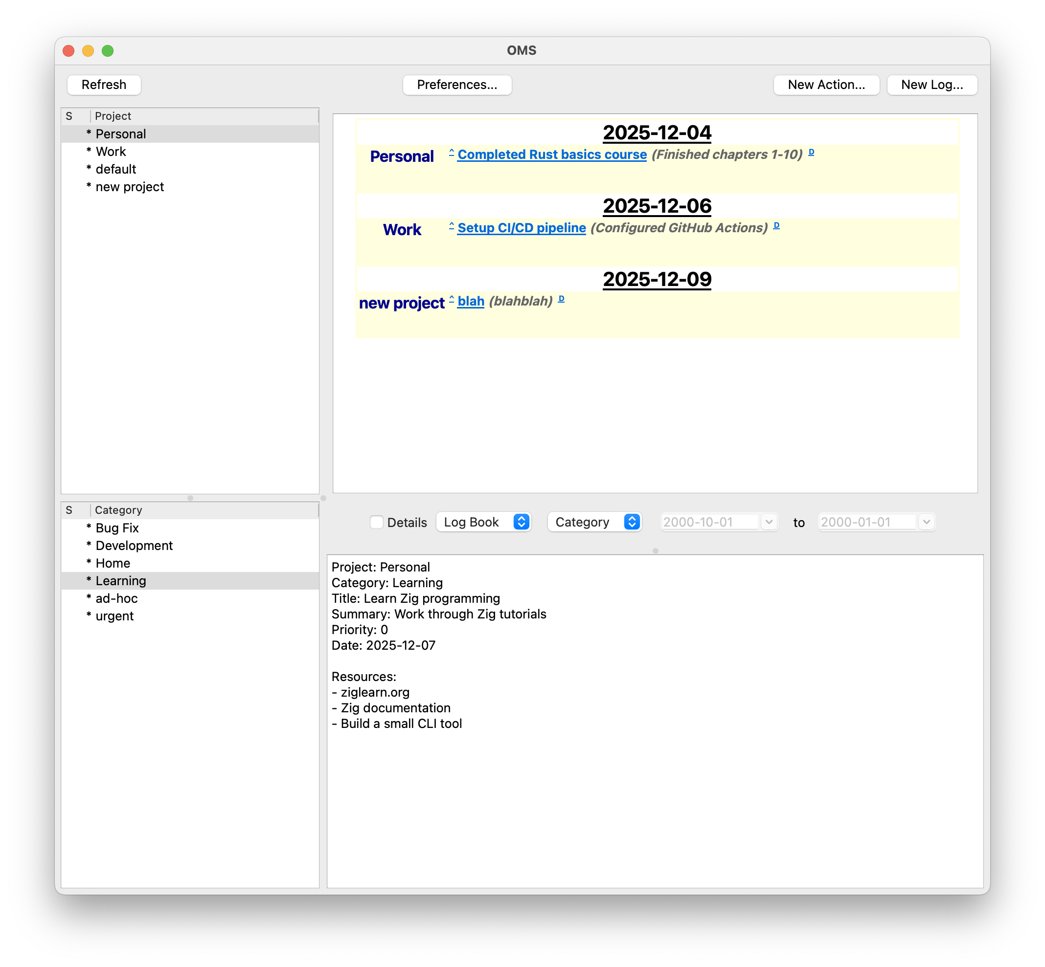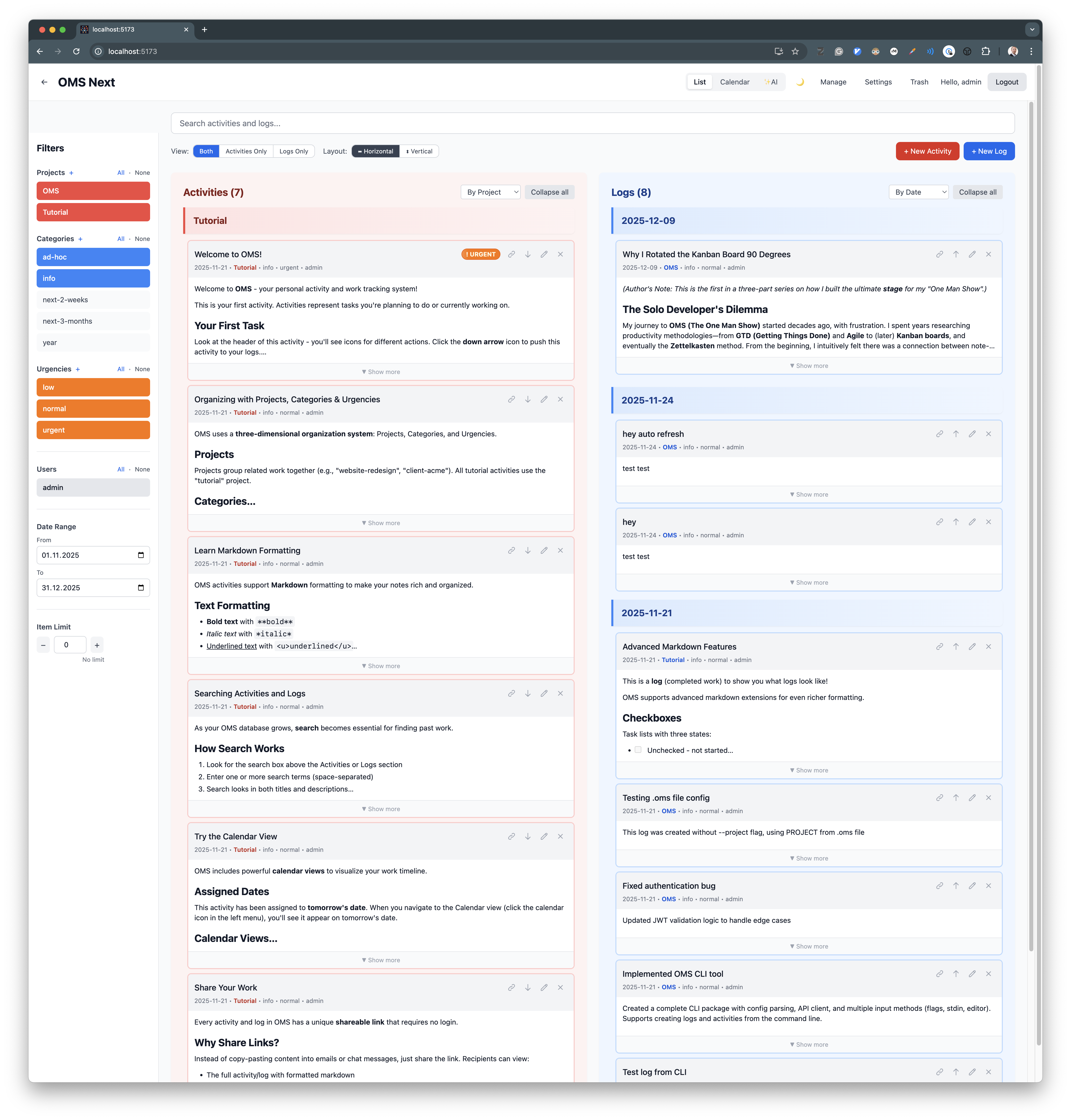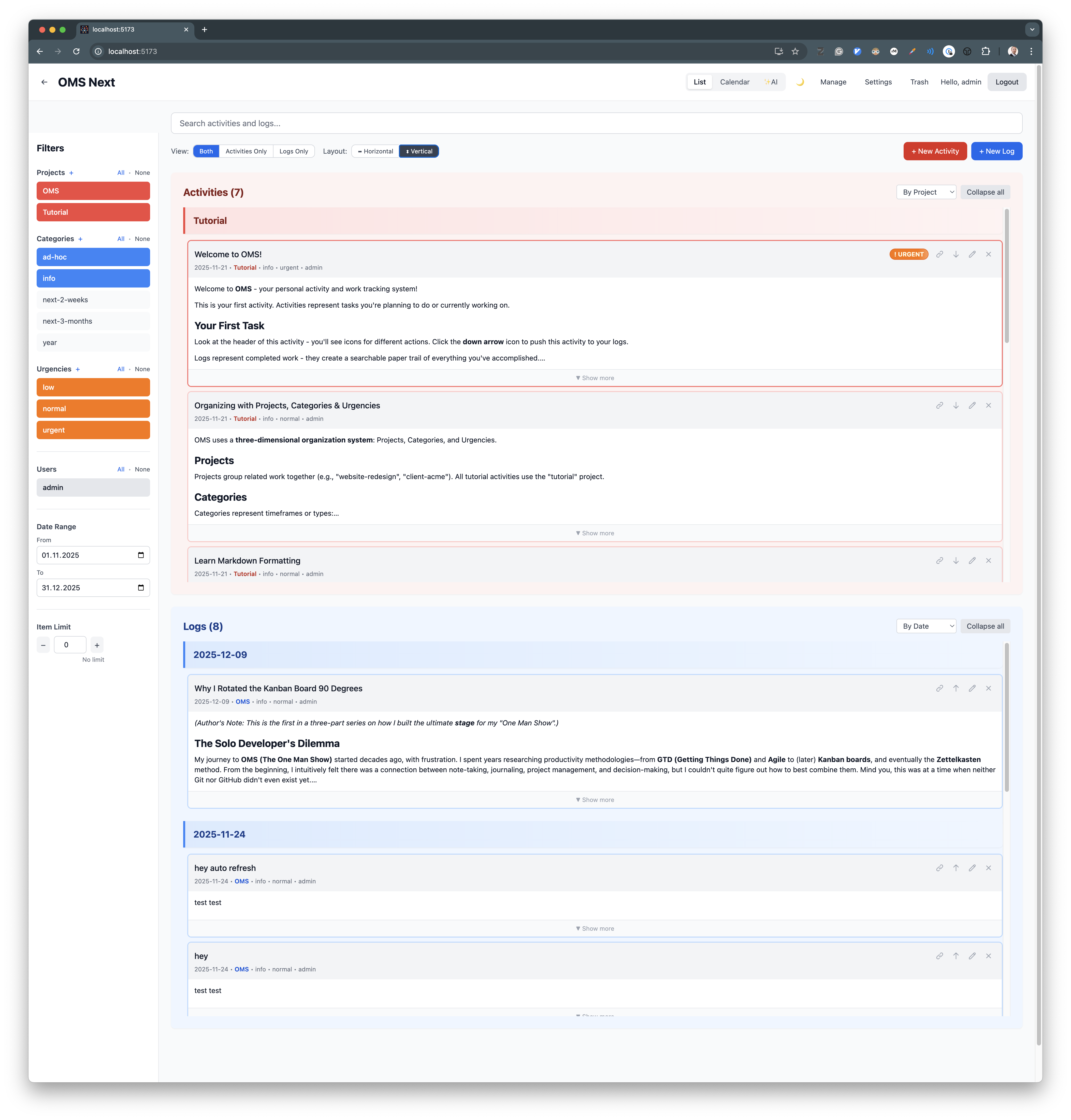 In OMS, consistency is key. Both Activities and Logs share the same powerful organization: I can group either of them by Project, Category, or Urgency. Within those groups, everything is automatically sorted by timestamp.