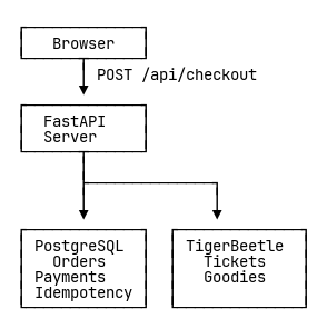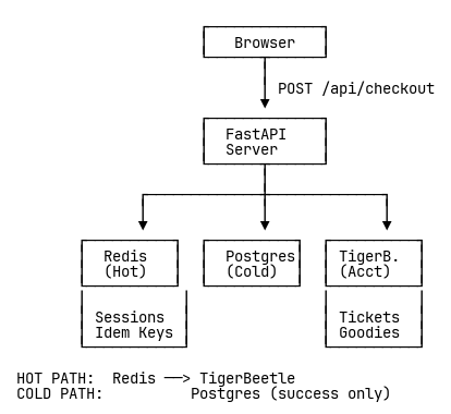 This insight reframed the entire problem: not all writes need durability. If a payment session is lost due to a server crash, the user gets redirected to the payment provider, the webhook can’t find the session, the user sees an error and retries. No money is lost, no tickets are double-sold. TigerBeetle handles the resource accounting (tickets and goodies) with full durability. PostgreSQL only needs to durably record successful outcomes.